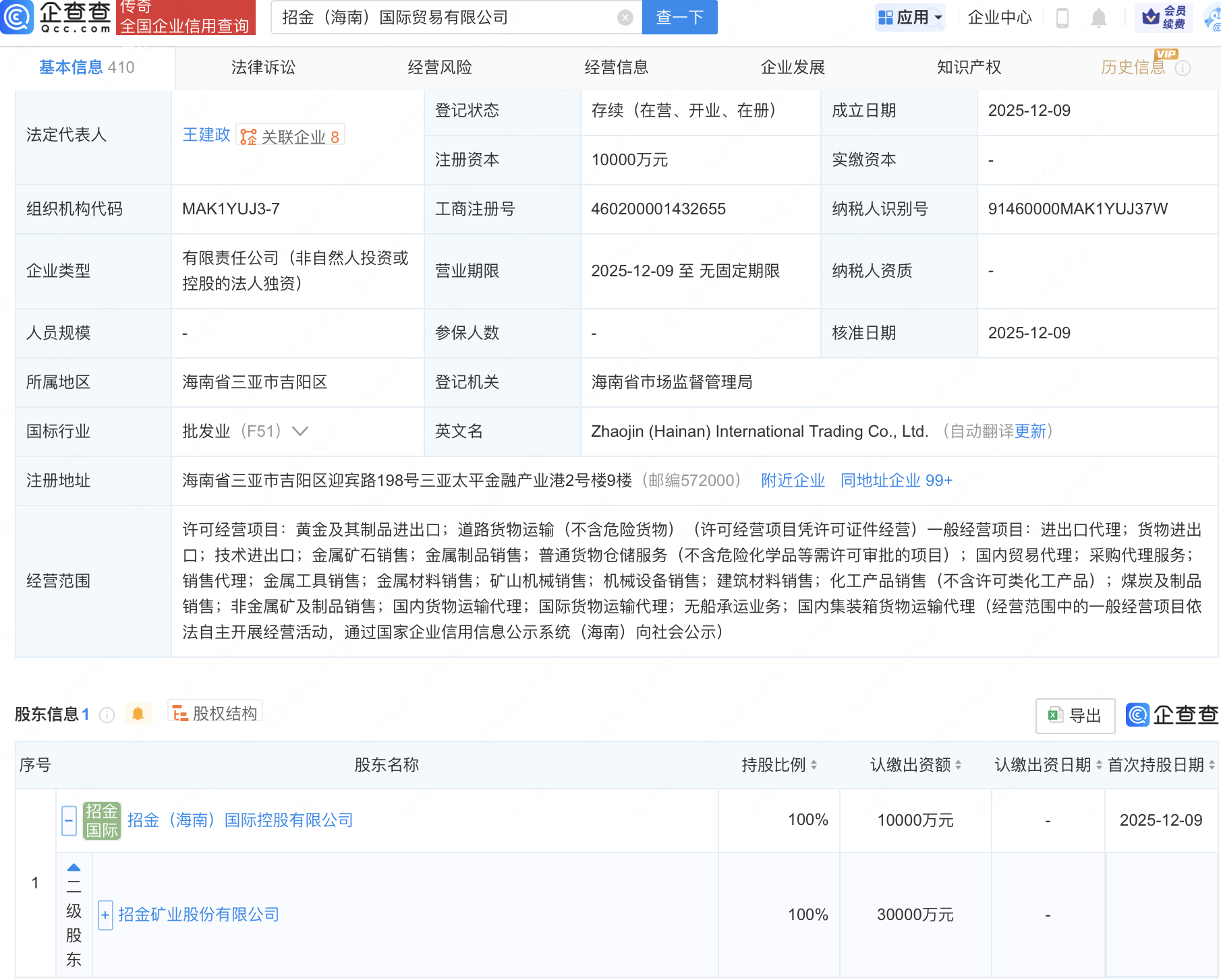 近日富腾优配,招金(海南)国际贸易有限公司成立,注册资本1亿元,经营范围包含:煤炭及制品销售;非金属矿及制品销售;国内货物运输代理;国际货物运输代理等。企查查股权穿透显示,该公司由招金矿业(01818.HK)间接全资持股。