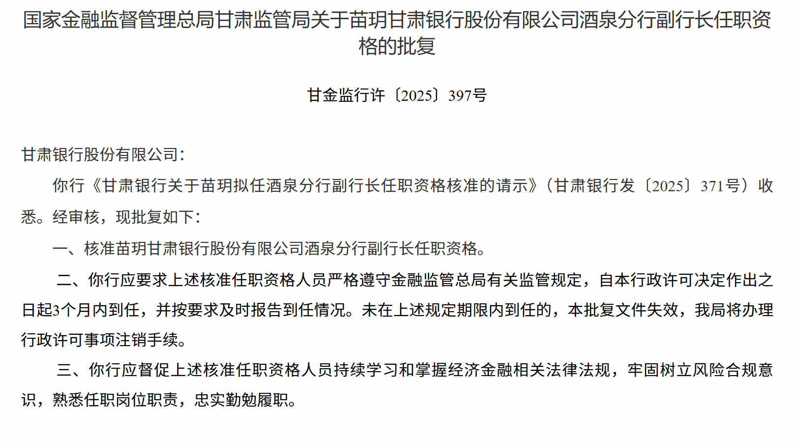 12月11日,国家金融监督管理总局甘肃监管局发布关于苗玥甘肃银行股份有限公司酒泉分行副行长任职资格的批复红盘,核准苗玥甘肃银行股份有限公司酒泉分行副行长任职资格。
