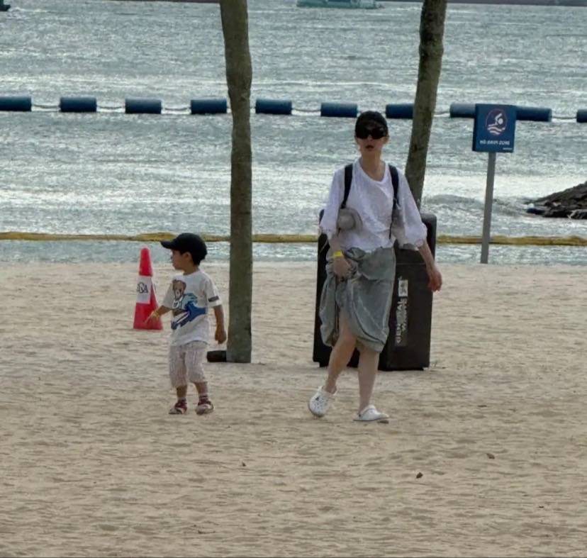 还有戚薇和3岁儿子在沙滩玩耍的照片,戚薇穿着洞洞鞋、一头提着裙摆,看到镜头的时候有点惊讶。