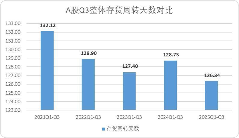 成本侧我们最后再来看一下企业前三季度营运情况的表现,首先最核心的是存货,继去年三季度库存周转天数回升后,今年A股整体的存货趋势再次向好,整体的库存周转天数下降了1.4天左右,来到了近五年的低位。