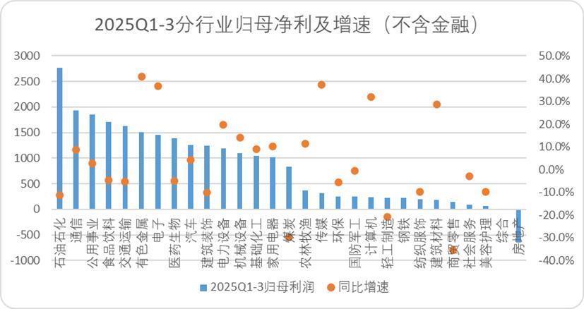 利润层面,体量最大的同样也是强垄断行业,而增速最快的除了营收侧表现强势的电子行业外,有色金属和传媒行业表现也不错。受益于周期影响,以及新能源车和AI发展,有色金属前三季度整体的归母利润增速达到了40.9%,传媒行业前三季度整体的归母利润增速也有37.2%。