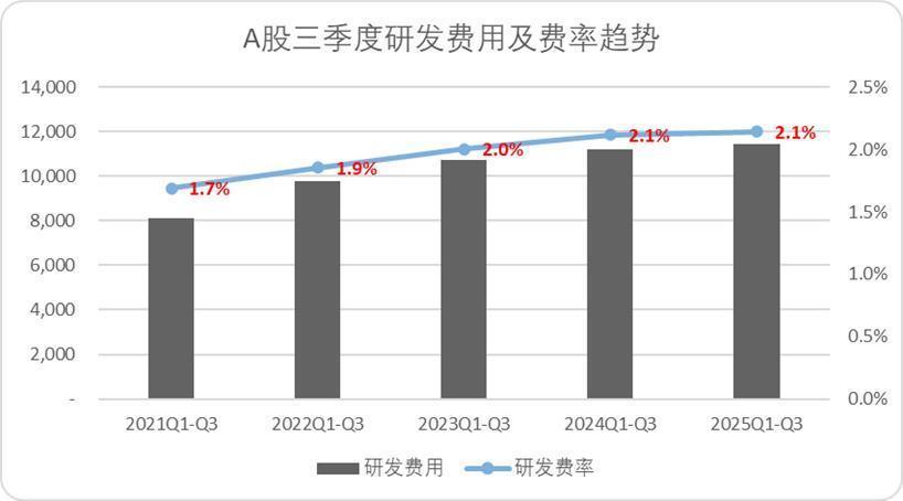 今年前三季度A股整体的研发费用累计录得1.15万亿,略高于去年同期,不过从费率结构来看,今年和去年的研发费率差距不大,仅仅提升了0.02pct。